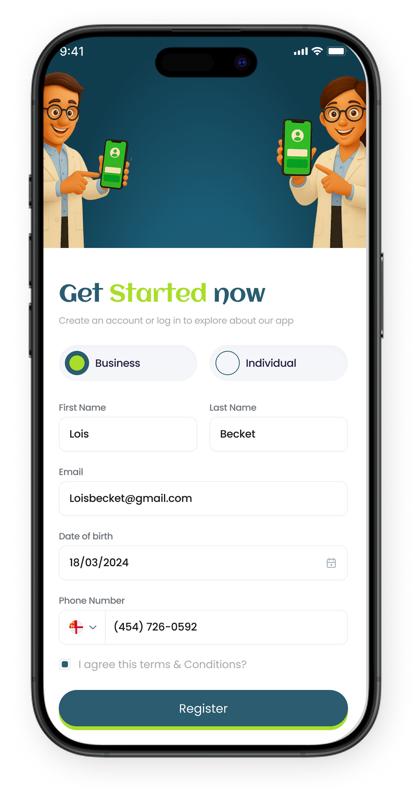 The Signup Screen provides a fast, intuitive, and compliant onboarding experience for BioTip eyeApp users. It supports two account types—Individual (home users) and Business (restaurants/vendors)—using a unified UI with backend-specific handling.