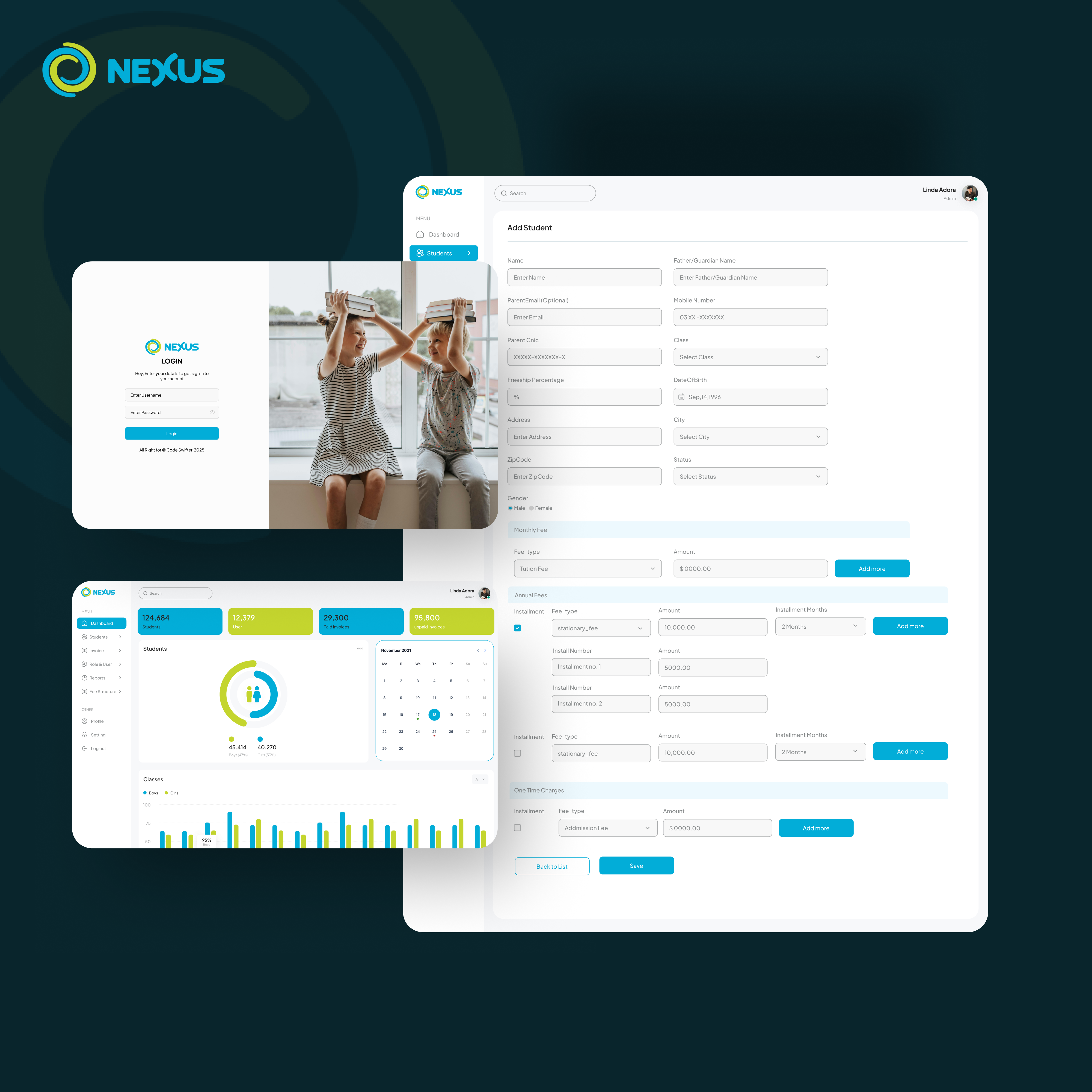 NEXUS is a modern School Management System built to digitalize student enrollment, fee tracking, and reporting. Developed with RectJS, Node.js, MySQl, and Tailwind CSS, it features role-based dashboards, automated invoicing, and real-time analytics. The system improved school efficiency by 80%, ensuring accuracy, transparency, and seamless communication across all users.
