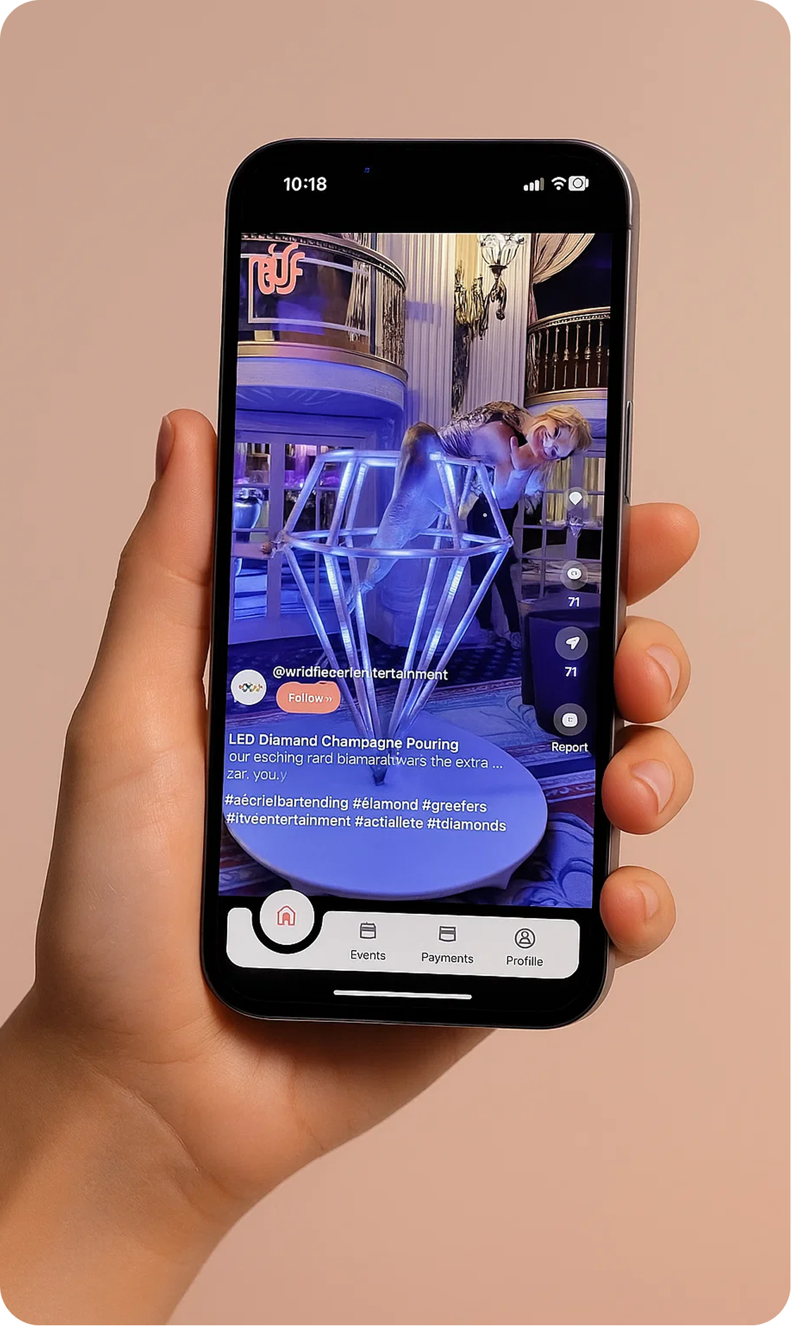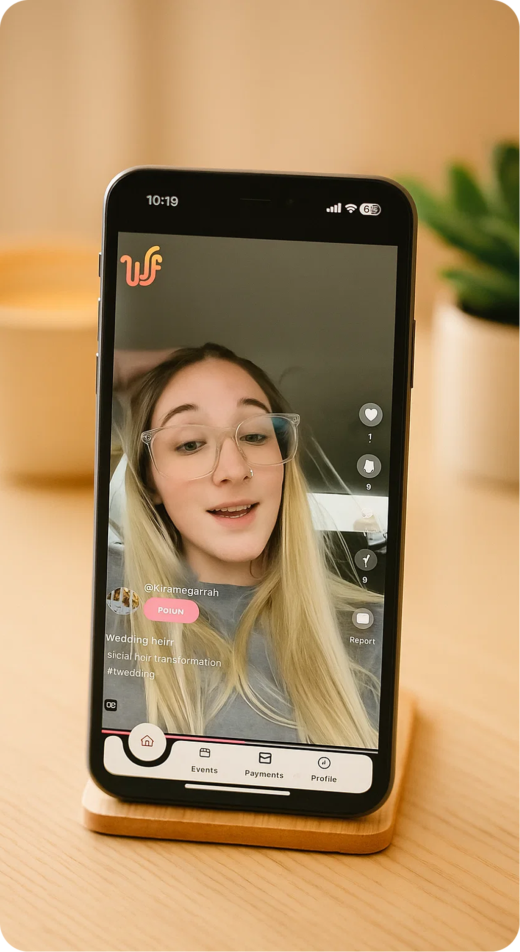 The Feeds Page is the social hub of WedFluencer, where users can watch, like, share, and comment on videos. It highlights featured posts and trending content in a smooth, interactive feed designed for seamless playback and easy engagement.